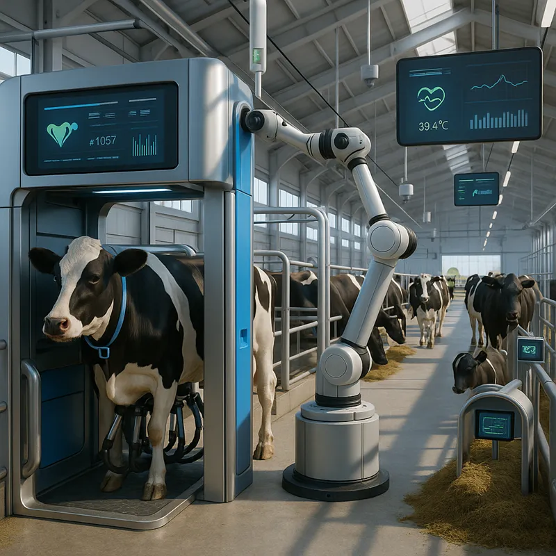 امروزه رباتها نه فقط در مزارع بسیار بزرگ، بلکه در دامداریهای متوسط و کوچک نیز به خدمت گرفته میشوند. رباتها با کمک حسگرهای زیستی (bio-sensors)، سامانههای شناسایی دام (RFID)، بازوی مکانیکی، دید رایانهای و یادگیری ماشینی، وظایفی را که زمانی فقط با انسان قابل انجام بود، با دقت و سرعت بالاتر انجام میدهند.