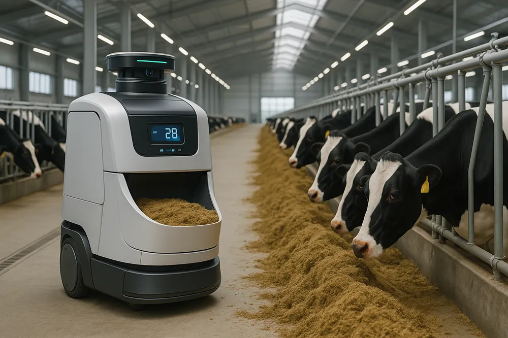 رباتهای خودران، خوراک دام را بهصورت برنامهریزیشده، دقیق و متناسب با رژیم هر دام در راهروها توزیع میکنند. این فرآیند نه تنها مصرف خوراک را هدفمند میکند بلکه سلامت و رشد دام را بهینه و ضایعات غذایی و هزینهها را کاهش میدهد. حتی امروزه رباتهایی برای جمعآوری خودکار علوفه باقیمانده و ارائه گزارشهای آنالیز تغذیهای وارد بازار شدهاند.